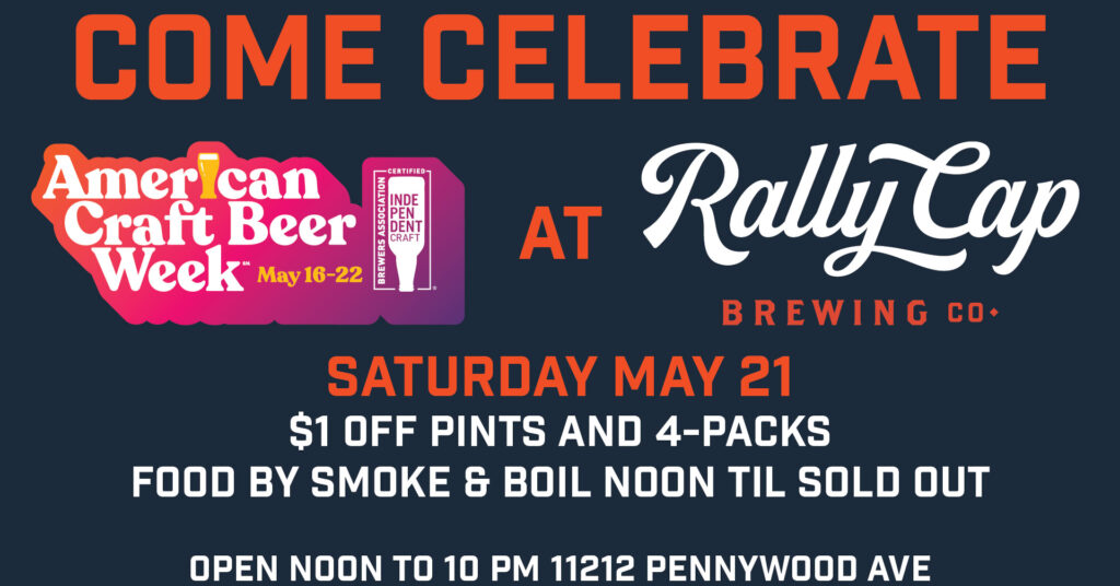 Come on out and help us celebrate American Craft Beer Week in the Rally Cap Taproom. We will have $1 off all pints and 4-packs bought in the taproom. Smoke & Boil will be out serving tacos and burritos from noon until they sell out.